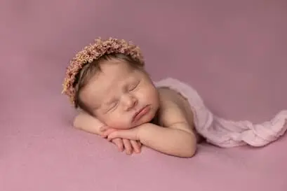 Bébé avec couronne de fleurs sur la tête et emmailloté sur fond rose.